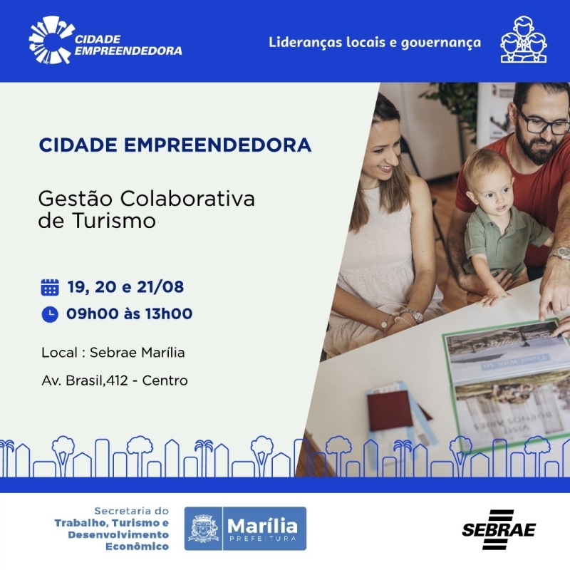 A Prefeitura de Marília, por meio da Secretaria Municipal do Trabalho, Turismo e Desenvolvimento Econômico, e o Sebrae (Serviço Brasileiro de Apoio à Micro e Pequenas Empresas), convidam para o curso “Gestão Colaborativa do Turismo”, em parceria com o Comtur (Conselho Municipal de Turismo) e Sinhores (Sindicato de Hotéis, Restaurantes e Bares de Marília). Com o objetivo de preparar os agentes ligados à atividade turística de Marília e região para pensarem e agirem estrategicamente no âmbito das políticas públicas no setor e alcançar o desenvolvimento turístico do território de forma sustentável, o curso Gestão Colaborativa de Turismo é resultado de uma conjunção de saberes do Sebrae-SP, dos órgãos municipais e estadual, bem como de outros atores e entidades que desenvolvem e realizam o turismo no Estado de São Paulo.